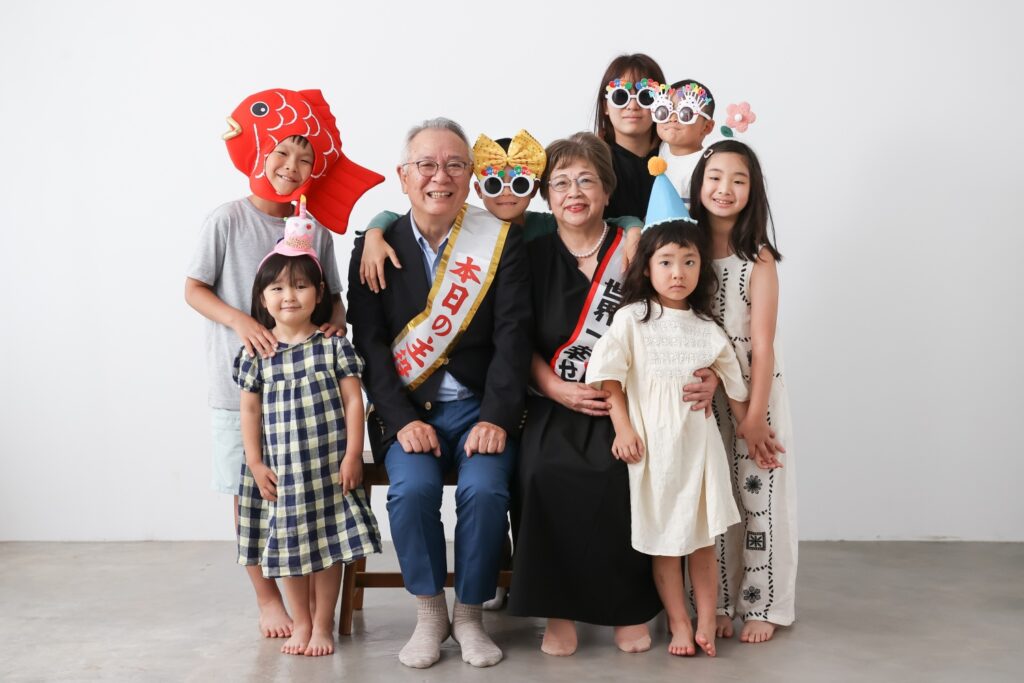 還暦や古希、米寿などの家族のお祝いや、金婚式や銀婚式などお二人の記念日などをはじめ、みんなで楽しく撮影をしましょう。もちろんなんでもない日の撮影も大歓迎!